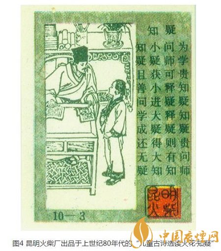 讀書學(xué)習(xí)貴在求教,一有疑問馬上向老師請(qǐng)教,以此獲得更大的進(jìn)步。上世紀(jì)80年代,昆明火柴廠十枚/套的“兒童古詩選讀”火花中,“知疑”(圖4)就定格于一名學(xué)童在向一名私塾先生提出自己的疑問后,傾聽私塾先生給他講解。畫面旁邊還配印有古詩“為學(xué)貴知疑,知疑貴問師。小疑獲小進(jìn),大疑得大知。知疑且善問,學(xué)成還無疑”。