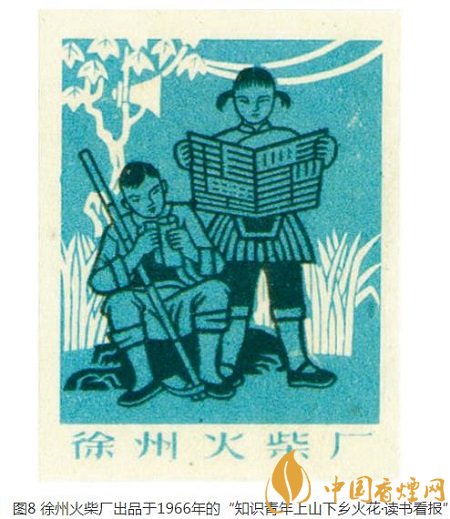 徐州火柴廠出品于同年的四枚/套的“知識(shí)青年上山下鄉(xiāng)”火花,“讀書看報(bào)”(圖8)一枚再現(xiàn)了一對(duì)知青利用休息間隙,在田間地頭讀書看報(bào)補(bǔ)充知識(shí)的畫面。