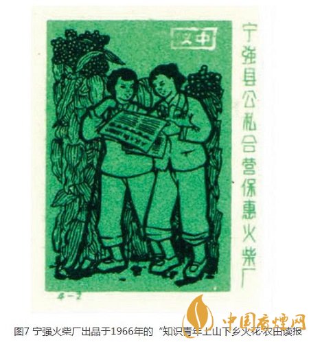 寧強(qiáng)火柴廠出品于同年的四枚/套的“知識(shí)青年上山下鄉(xiāng)”火花,其中“農(nóng)田讀報(bào)”(圖7)一枚,反映了兩名下鄉(xiāng)女知青在生長(zhǎng)茂盛的農(nóng)田地頭捧讀《人民日?qǐng)?bào)》,藉以尋求怎樣讓農(nóng)田獲得高產(chǎn)的良策。