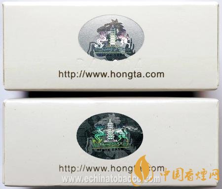背面商標(biāo)紙印刷工藝差異對比:真品商標(biāo)紙采用白卡紙,凹印印刷,“Hongtashan”字體用手摸沒有凹凸感,“紅塔”左邊上下兩朵云距離塔身較遠(yuǎn);假煙采用高清掃描仿制印刷,“Hongtashan”字體用手摸有凹凸感,“紅塔”左邊上下兩朵云離塔較近,與真品特征存在明顯差異。