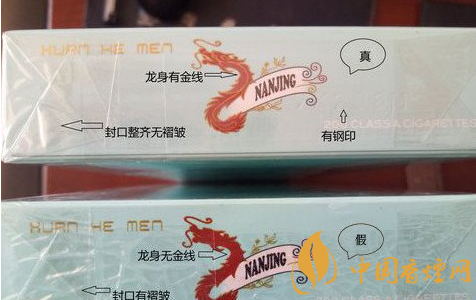 南京煊赫門的正品商標與假貨是有明顯區別的,真煊赫門商標的“紅龍”區域經過亞光處理,所以看起來是暗紅色,而假的煊赫門商標是用的亮光處理,看起來是亮紅色的。除此之外,真品的紅龍印刷的非常精細準確,仿冒品的紅龍經常沒有印全。