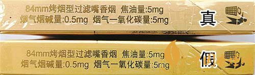 2.背面商標(biāo)紙印刷工藝差異對(duì)比:真煙背面中間“花球”圖案采用壓凸?fàn)C金工藝,用手摸凹凸感明顯,且“花球”線條清晰;假煙采用高清掃描仿制印刷,中間“花球”圖案用手摸無凹凸感,且“花球”線條模糊、部分區(qū)域有粘連重疊。