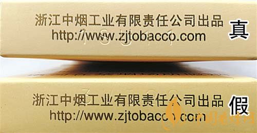 3.小盒底部鋼印差異對(duì)比:真煙鋼印為機(jī)器動(dòng)態(tài)打印,整體鋼印較深、間距不等,其位置與企業(yè)網(wǎng)址重疊;假煙鋼印一般為手工靜態(tài)打印,鋼印較淺,位置與文字重疊。
