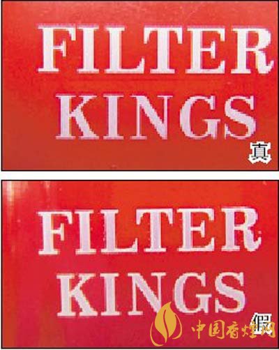 2.小盒側(cè)邊“FILTER KINGS”白色英文字防偽效果對(duì)比:用紫外燈照射其3到5秒鐘,真煙照射處的白色字會(huì)變成紫紅色,關(guān)掉紫外燈等幾秒鐘后,變色處會(huì)恢復(fù)為原先的白色,且白色字體邊緣光滑、表面干凈;假煙的防偽變化效果較差,字體邊緣有毛渣和印刷留下來(lái)的污點(diǎn)。