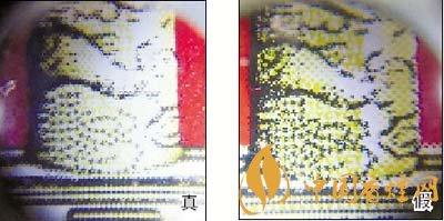 1.小盒正面商標(biāo)紙?zhí)咨珷C金工藝對(duì)比:真煙天安門(mén)左側(cè)華表套色均勻,黃白色分布有明顯分界點(diǎn),邊緣光滑、干凈、清晰;假煙套色較差,黃白色不明顯,黃色部分印刷較分散,字體邊緣套印有毛渣點(diǎn),呈現(xiàn)鋸齒狀。