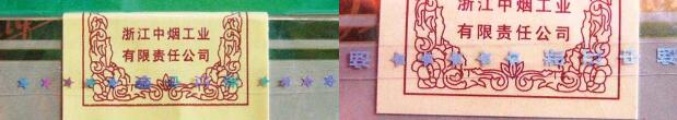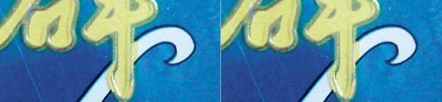 3.看小盒商標印刷細節(jié),真煙的印刷方式為凹印、膠印相結(jié)合,“群”字下方黃色筆劃部分邊緣呈鋸齒狀,而黑色筆劃邊緣則是光滑的;而假煙則是采用膠印方式印刷,字體筆劃邊緣都是光滑的。