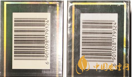 煙用包裝膜材質及條形碼對比:真品卷煙條包裝膜材質光滑,均勻無皺褶,條形碼區域呈淡黃色,套色均勻清楚。假煙條包裝膜材質粗糙,有不均勻皺褶,條形碼區域為白色,套色邊緣放大后模糊不清。