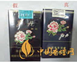 正面商標紙差異對比:真品卷煙采用絨面印刷工藝,花形悉心勾勒,更顯質感,圖案“牡丹花”更為寫實。假冒偽劣“牡丹(軟藍)”多以舊版“牡丹花”造型進行模仿,其圖案與真品存在明顯差異。