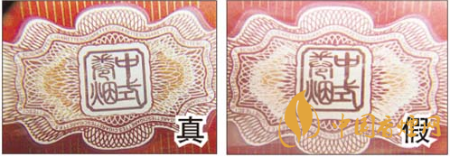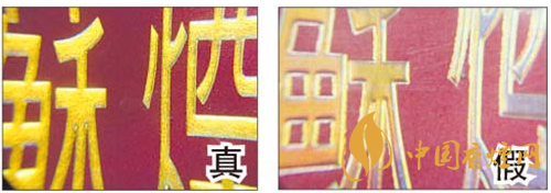 真煙燙金字體線條清晰、不漏金,金色部分成色純正;假煙燙金字體線條不清晰,有漏金現(xiàn)象,金色部分成色暗淡。