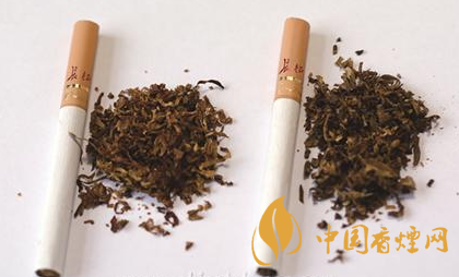 煙支過濾嘴及煙絲差異對比:真煙煙支采用單一醋纖濾嘴,長度為25mm,煙絲切絲寬度均勻,煙絲疏松、光澤油潤性好、呈檸檬黃色、含碎末少,煙絲結構為葉絲、膨脹葉絲、膨脹梗絲和再造煙葉;假煙煙支過濾嘴較短,長度約為20mm,制絲工藝粗糙,色澤發暗無光澤、呈青褐色、煙絲中含碎末較多,大量梗絲未經過膨脹處理,一般無膨脹葉絲和再造煙葉,與真品特征存在明顯差異。