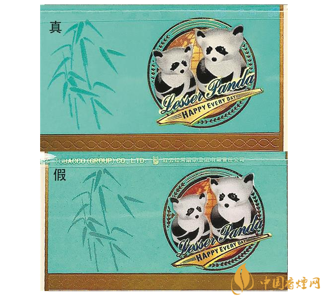 正面文字差異對比:真煙“小熊貓”字樣字體較粗,字形渾厚有力,凸起明顯,燙金緊湊均勻;假煙“小熊貓”字樣字體較細,似連似斷,凸起不明顯,邊緣燙金較寬。