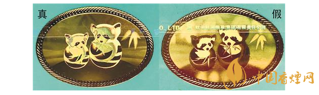 鐳射防偽標識差異對比:真煙鐳射防偽標識清晰、無漏色,竹葉葉片清晰光滑無條紋,兩只小熊貓身上和頭頂的毛粗細均勻;假煙鐳射標識粗糙模糊,竹葉葉片有條紋狀,兩只小熊貓有漏色,身上和頭頂的毛粗糙不均勻。