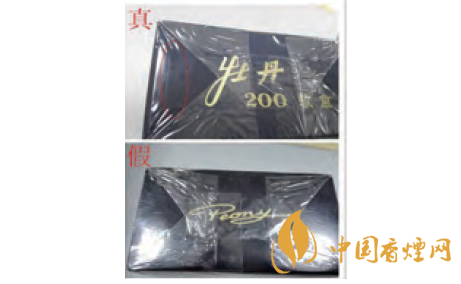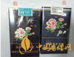 正面商標紙差異對比:真品卷煙采用絨面印刷工藝,花形悉心勾勒,更顯質感,圖案“牡丹花”更為寫實。假冒偽劣“牡丹(軟藍)”多以舊版“牡丹花”造型進行模仿,其圖案與真品存在明顯差異。
