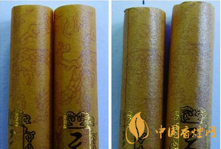 小盒商標(biāo)紙印刷工藝差異對比:真品小盒商標(biāo)紙圖案樣式借鑒乾隆年代的皇家御用器盒,名為“海水江崖云龍”圖樣,有“龍飛在天,福澤天下”的吉祥寓意,采用雕刻激光定位燙金印刷工藝,圖樣呈現(xiàn)出凹凸有序,層次分明的立體感,真品印刷工藝細(xì)致,圖樣及字體清晰完整無缺;假煙采用仿照技術(shù),圖樣印刷工藝粗糙,脫漆掉色漏印明顯,與真品印刷工藝存在明顯差異。