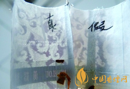 真品小盒正反面均采用具有黃色、紅色、紫色、藍(lán)色和綠色等干涉色的效果珠光油墨,在不同光線角度下會(huì)呈現(xiàn)出不同顏色,同時(shí)也具有能阻止掃描儀、電分機(jī)及彩色復(fù)印機(jī)的復(fù)制功能;假煙在不同光線角度無(wú)法呈現(xiàn)出彩色光線變化,因多采用高清掃描復(fù)制,其圖片多邊緣呈現(xiàn)顆粒粗大的網(wǎng)格狀,與真品材質(zhì)存在顯著差異。