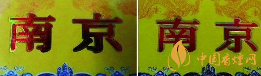 小盒商標紙印刷工藝差異比對:真品卷煙小盒商標紙“南京”字體印刷由無數個相等小圓點組合而成且立體感強,印刷工藝水平技術含量高,不易被仿制印刷;假煙小盒商標紙“南京”字體采用普通仿制套印燙金工藝,字體沒有立體感和線條層次感,套印燙金工藝粗糙且邊緣有毛渣,與真品印刷工藝差異明顯。