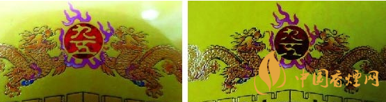 小盒商標紙燙金套印工藝差異比對:真品卷煙小盒商標紙雕刻燙金套印工藝,龍鱗顏色均勻一致,龍珠里“九五”兩字燙金字體飽滿;假煙印刷工藝仿制粗糙,龍鱗顏色失真,龍珠里“九五”套印不準,字體邊緣有明顯脫漆掉色現象,與真品呈現效果差異明顯。