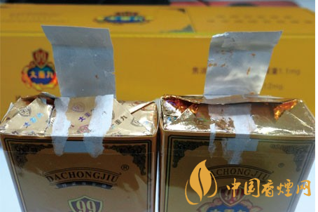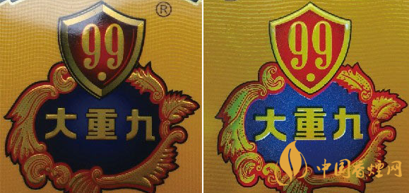 小盒商標印刷工藝差異比對:真品小盒商標紙正面印刷工藝以藍色為底燙印“大重九”字樣,邊緣采用精雕細刻雕版燙金技術,套色燙金均勻完整;假煙小盒商標印刷采用“掃描照相”等仿制技術,套色燙金嚴重失真,商標圖案呈現出的效果與真品商標圖案差異明顯。