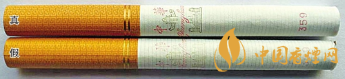 煙支印刷差異對(duì)比:真煙煙支過(guò)濾嘴上的兩個(gè)金色圓圈較寬;假煙煙支過(guò)濾嘴上的兩個(gè)金色圓圈較窄。