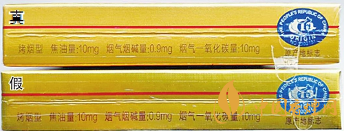 正面商標(biāo)紙印刷工藝差異對(duì)比:真煙商標(biāo)紙采用壓凸?fàn)C金工藝,中間天安門圖案用手摸凹凸感明顯,且天安門城墻上有細(xì)密的橫線條;假煙采用高清掃描仿制印刷,中間天安門圖案用手摸凹凸感不明顯,且天安門城墻上沒(méi)有橫線條。
