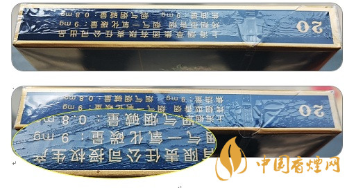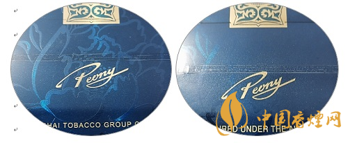 真品卷煙:藍(lán)色牡丹花圖案,側(cè)光觀察線條明亮、反光度強;線條油墨厚實,手摸有凸起感。