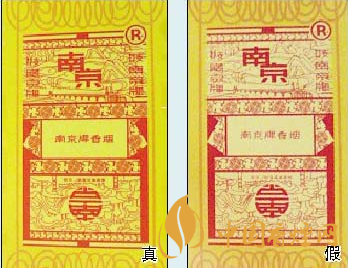 真煙條盒側面、小盒底部的老南京注冊商標圖案,紅色以外的底色部分發黃;假煙的老南京注冊商標圖案發白,圖案模糊。