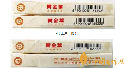 真煙:黃金葉(天香細支)拉線頭位置(在標有生產廠家)在條形碼左側,條形碼及數字筆畫較細。